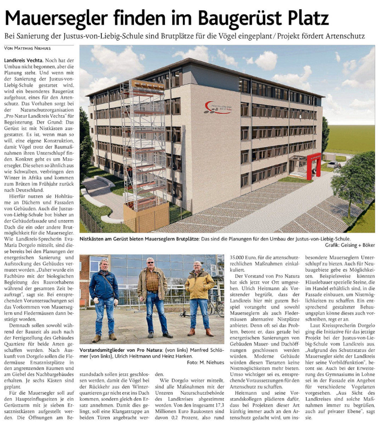 Pro Natura unterstützt zahlreiche Projekte damit die Mauersegler einen Brutplatz finden, wie in diesem Fall im Baugerüst Justus-von-Liebig-Schule.